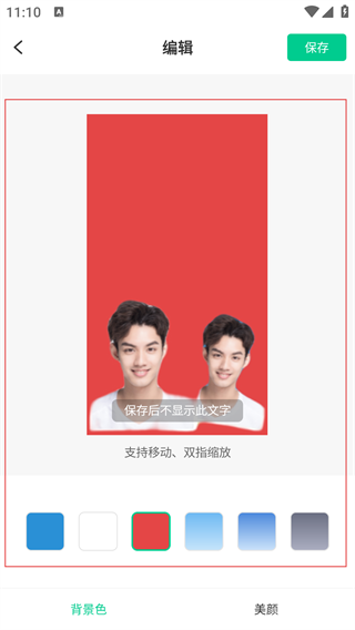 4、【编辑】界面可选背景色、移动缩放人像,编辑后点【保存】即可。