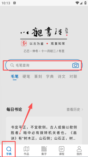 1、进入平台首页,顶部搜索框可查询毛笔相关内容,下方有毛笔、硬笔等分类标签,还能查看每日书论板块。