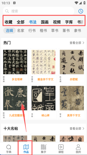 2、点击底部 “作品” 选项,进入后选择 “书法” 分类,可看到多宝塔碑、曹全碑等热门书法作品展示。