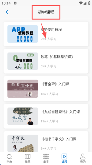 3、切换至 “课程” 页面,选择 “初学课程” 标签,能看到 APP 使用教程、硬笔基础常识课等入门学习内容。