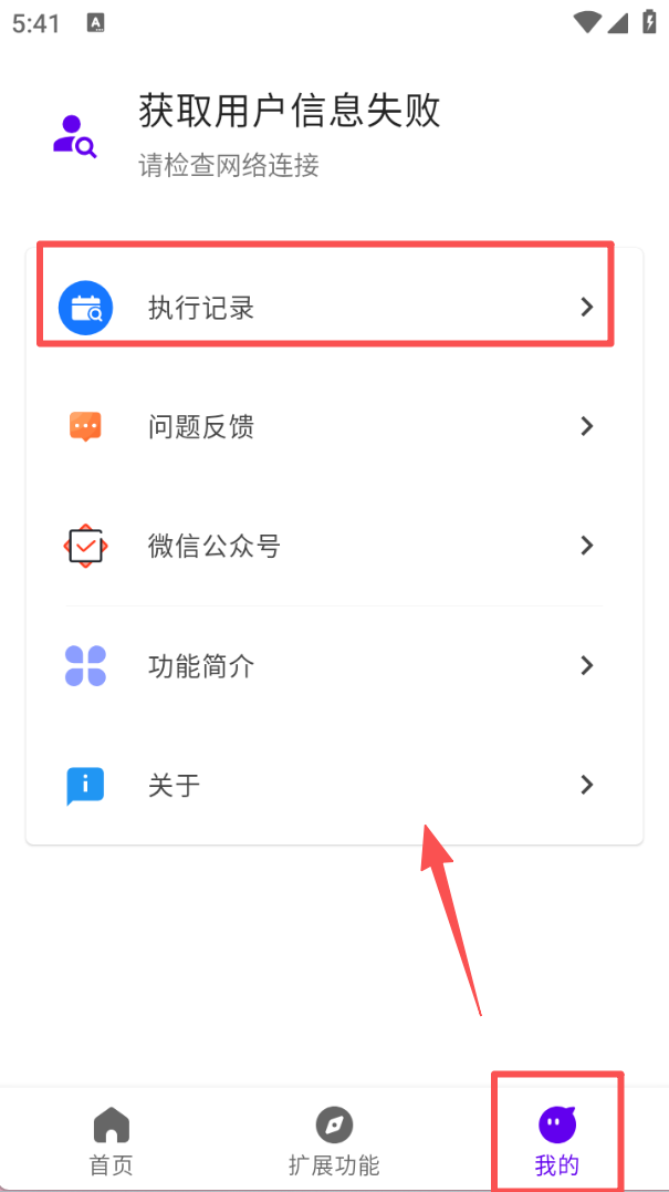 4、进入 “我的” 界面,能查看执行记录,也可提交问题反馈、关注公众号,了解功能相关信息。