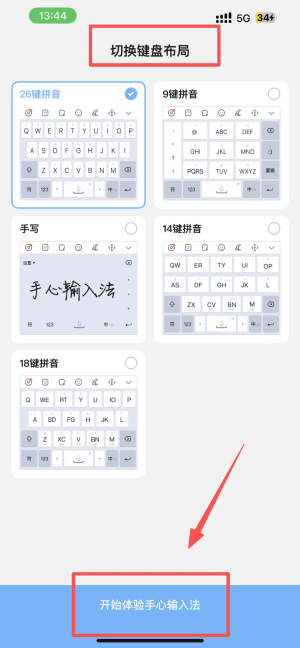 2、切换键盘布局,可选择 26 键拼音、9 键拼音等多种布局,然后点击开始体验手心输入法。