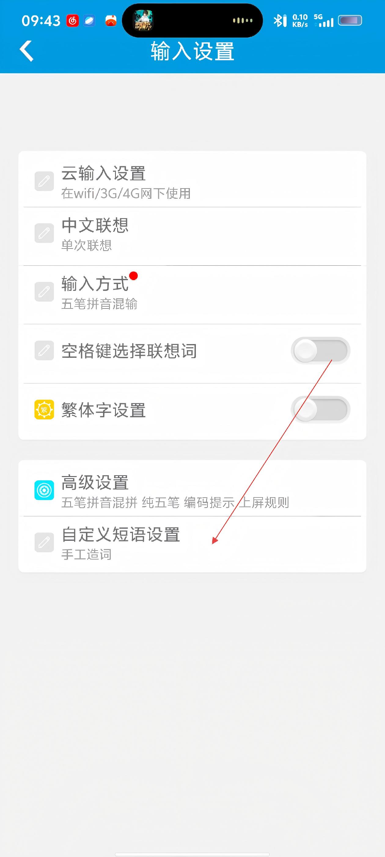 3、在【输入设置】页面,能设置【云输入设置】【中文联想】等,若需自定义短语,点击【自定义短语设置】。
