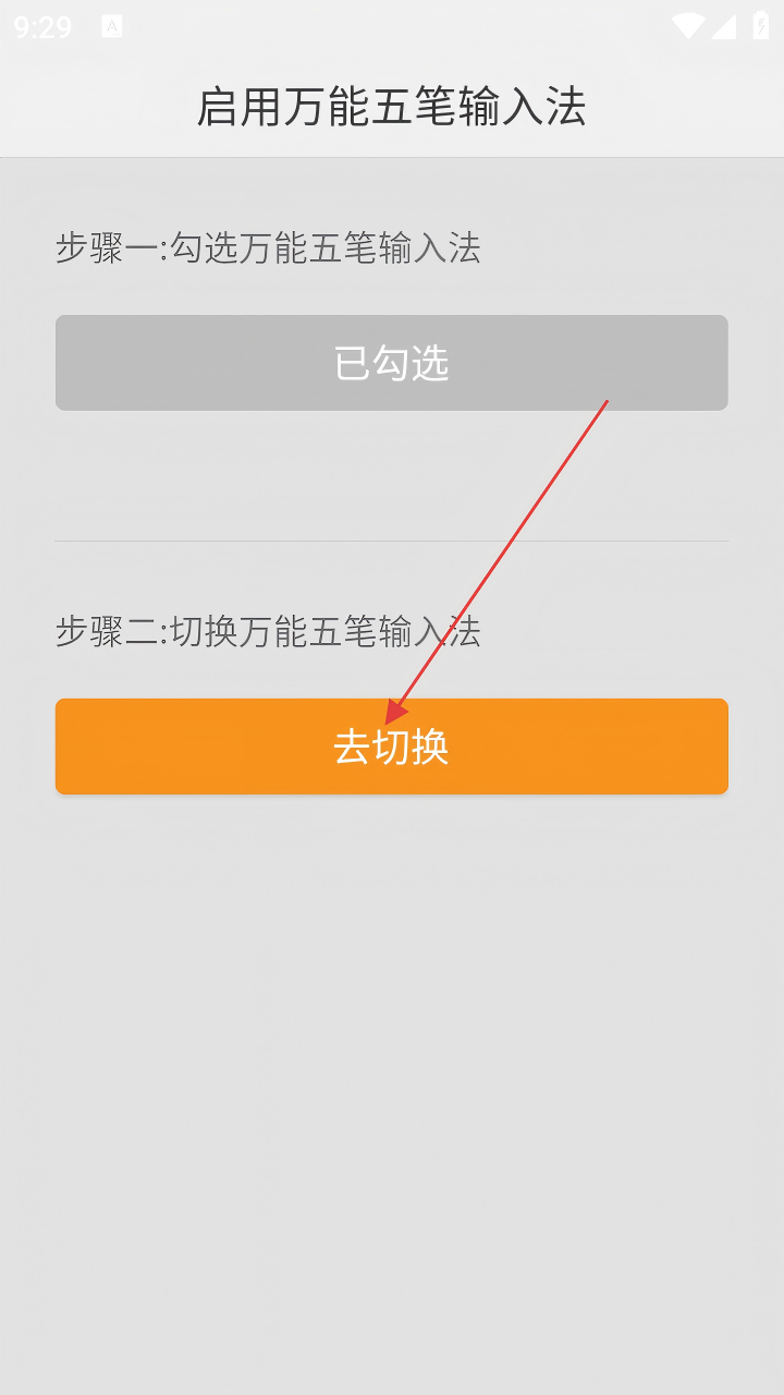 4、勾选完成后,回到启用界面,点击步骤二的【去切换】按钮,切换到【万能五笔输入法】,即可完成启用。