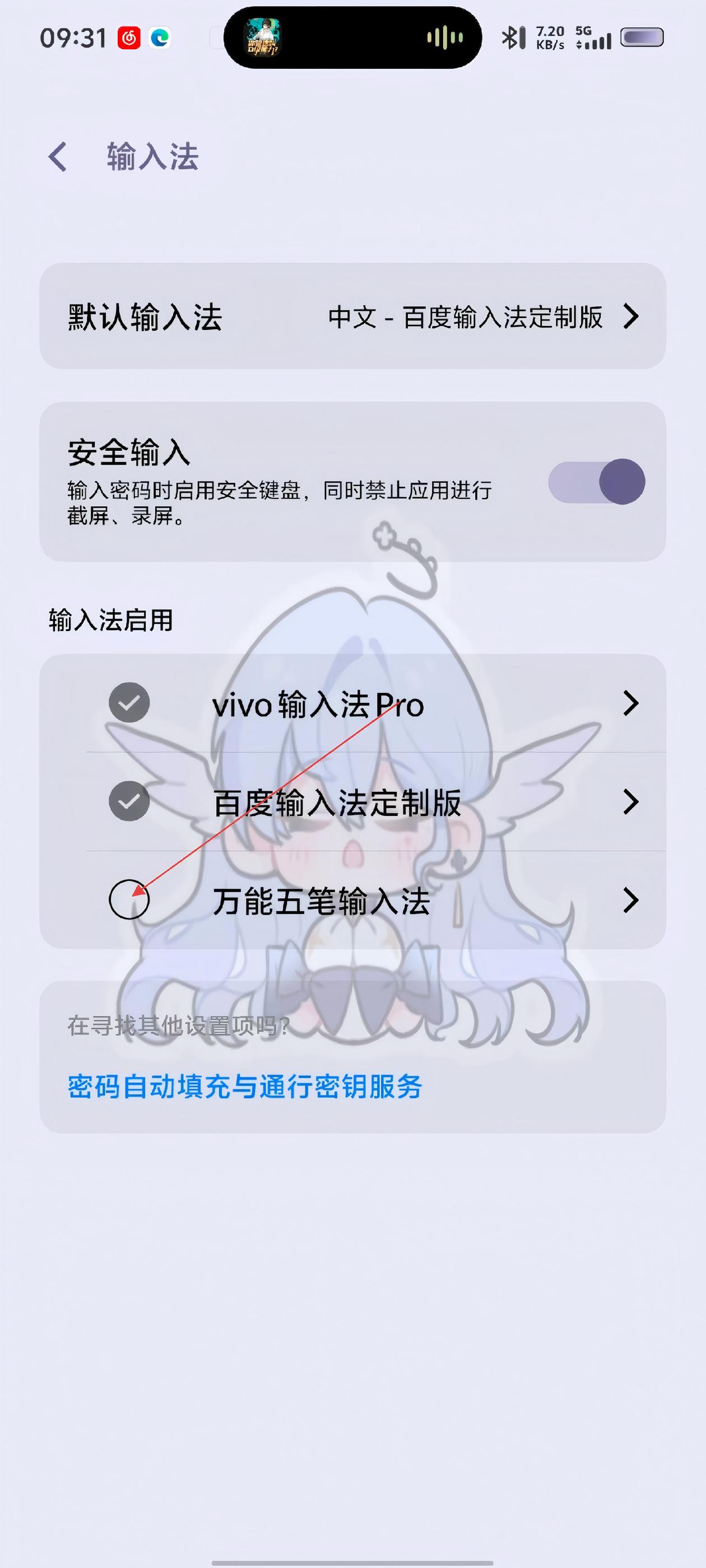 3、在输入法设置页面,找到【万能五笔输入法】选项,勾选其左侧的选择框,完成勾选设置。