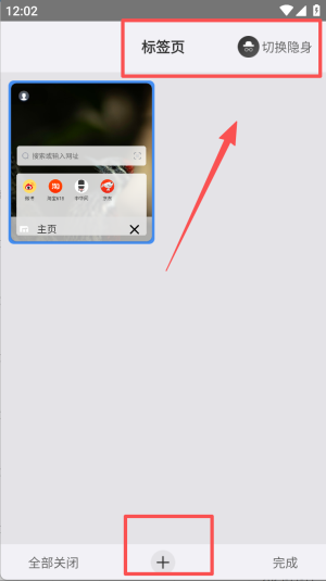 3、点击标签页图标选“切换隐身”,无痕模式关闭后自动清空记录。