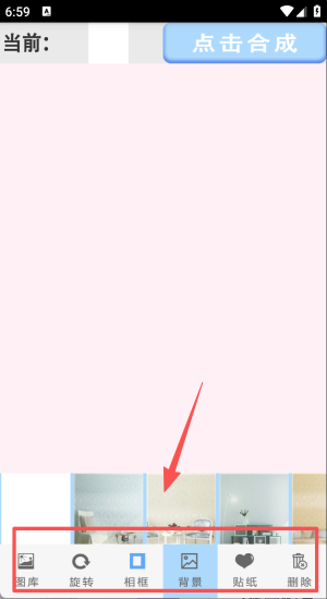 4、打开“画中画”点“图库”换背景加贴纸,旋转相框一键合成分享。