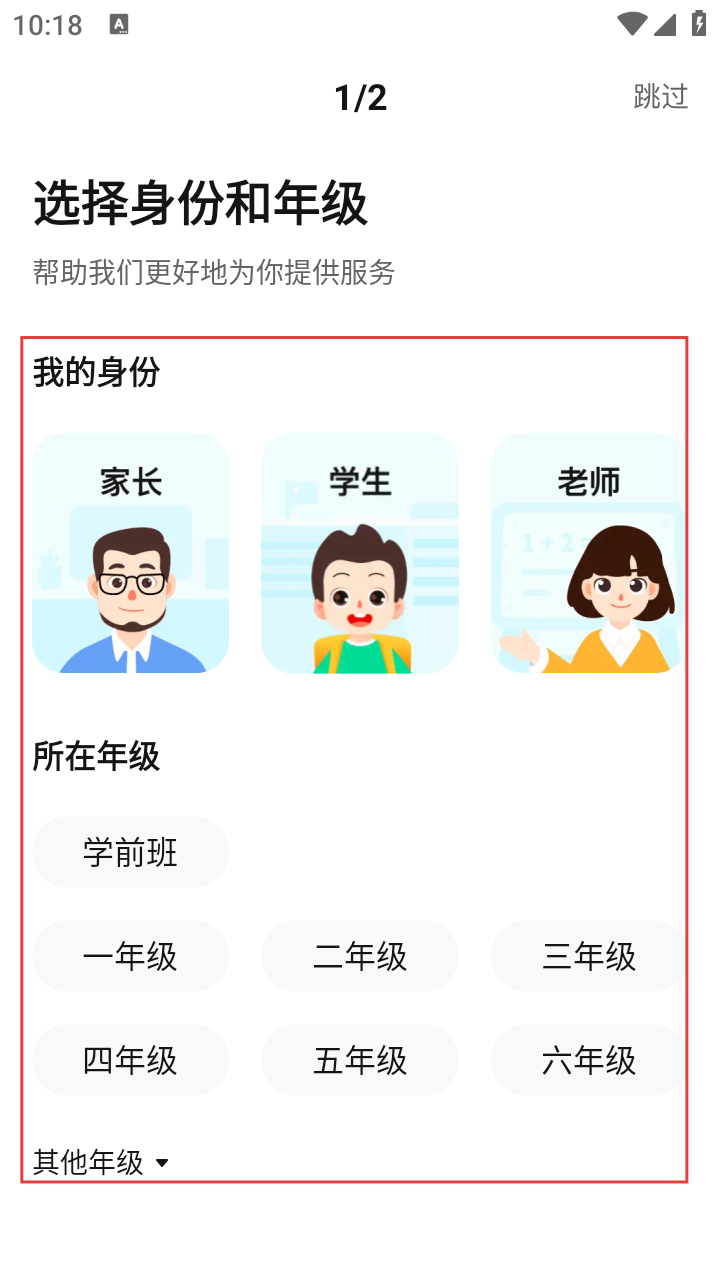 1、进入软件后,先在【选择身份和年级】页面,根据自身情况选择【家长】【学生】或【老师】身份,再选对应年级。