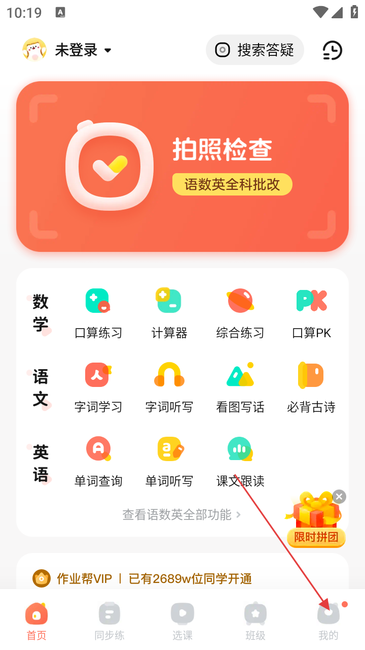 2、进入首页,能看到【拍照检查】等功能,还有数学、语文、英语学科的各类学习模块,若要查看个人相关,点击右下角【我的】。
