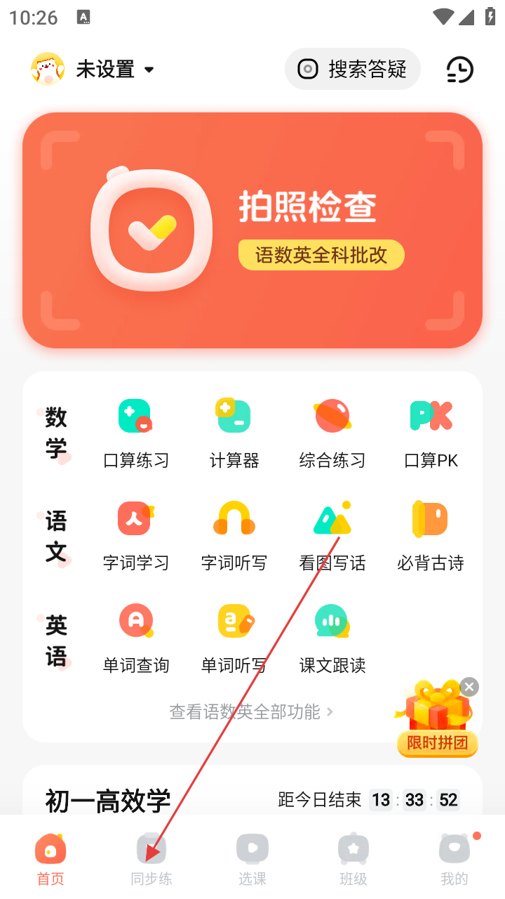 1、进入软件首页,若要进行同步练习,点击底部【同步练】按钮,即可进入相关页面。