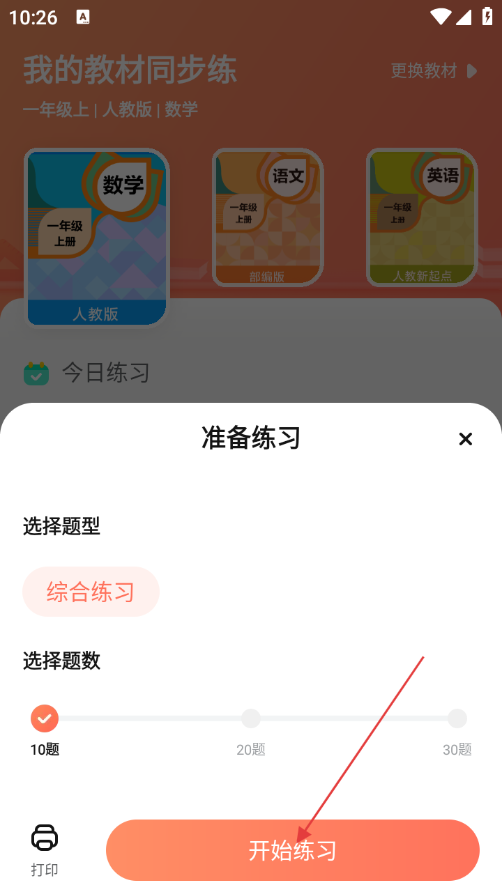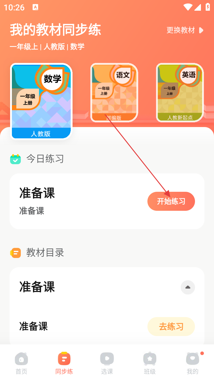 2、在【我的教材同步练】页面,选择对应学科教材后,找到【开始练习】按钮并点击,准备开始练习。