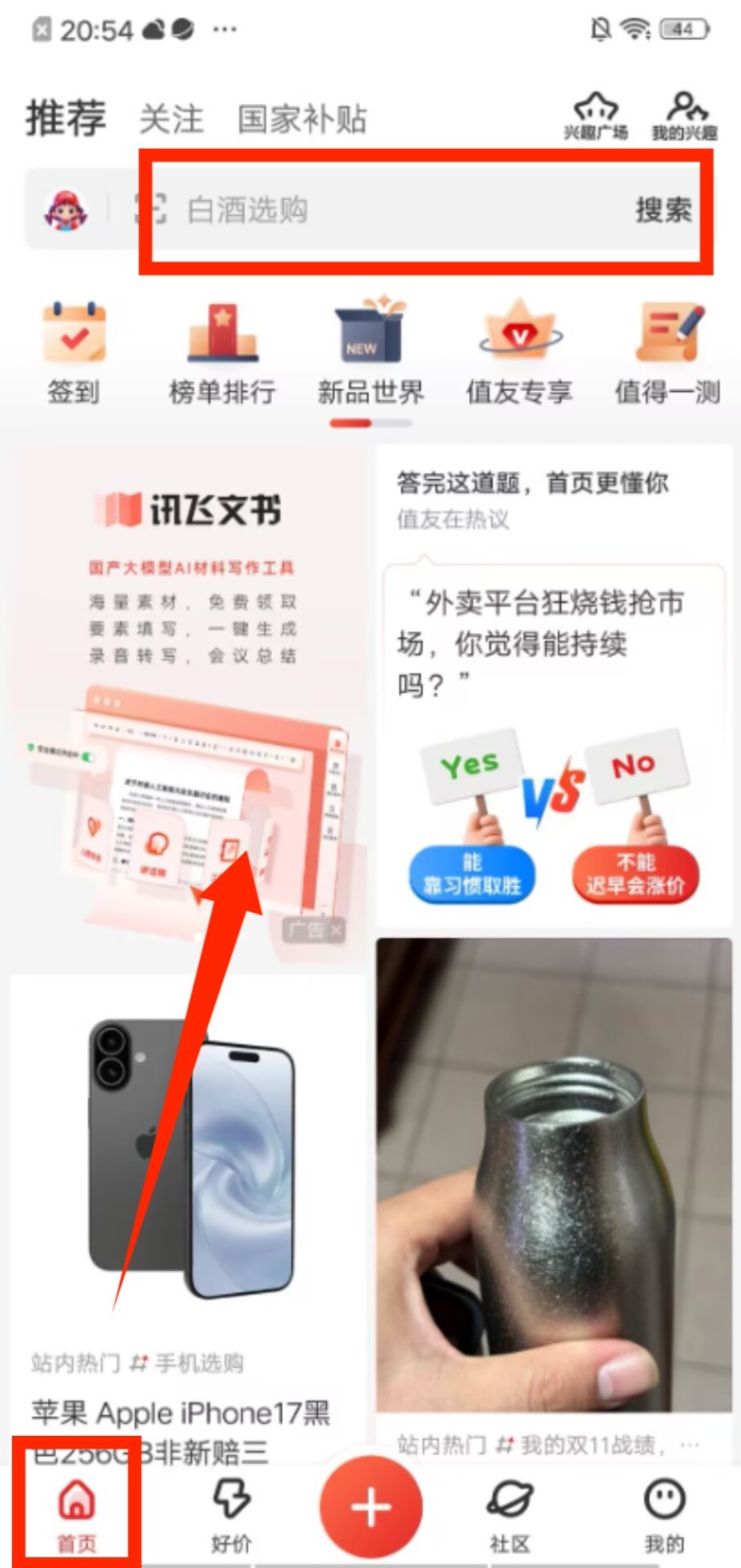 1、进入首页,点击顶部搜索框输入内容查找好物推荐,也能通过 “签到”“榜单排行” 等入口参与互动。