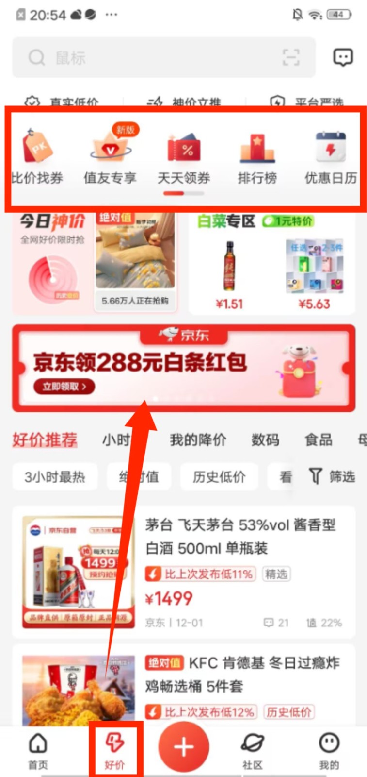 2、切换到好价页面,在 “比价找券”“天天领券” 等板块,可领取平台优惠,查看今日低价商品。