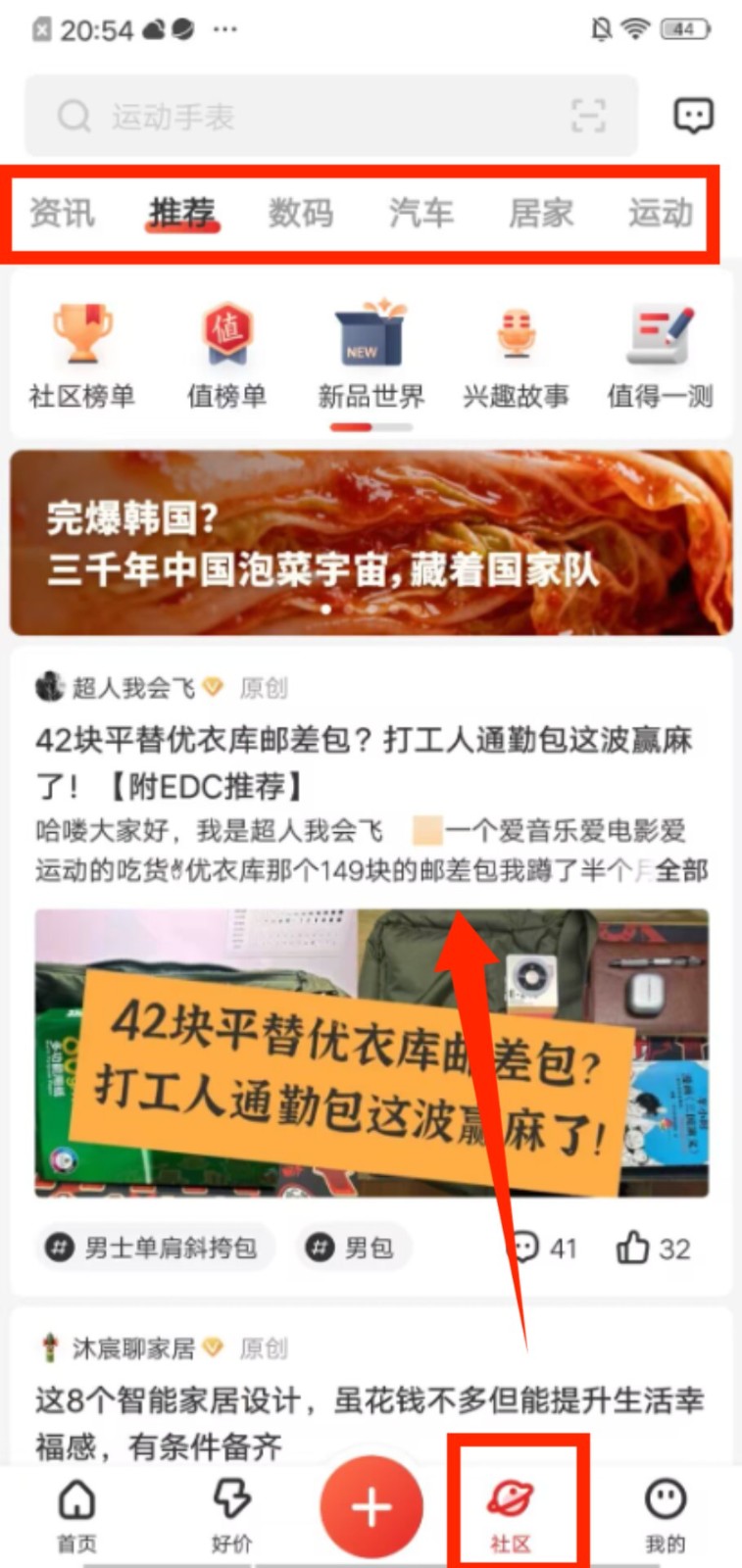 3、打开社区页面,在 “推荐”“数码” 等分类下浏览用户分享的内容,也能参与话题讨论交流体验。