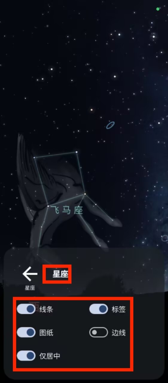 2、在弹出的菜单中选择 “星座” 选项,能看到线条、标签等多个开关选项,可按需开启或关闭对应显示项。