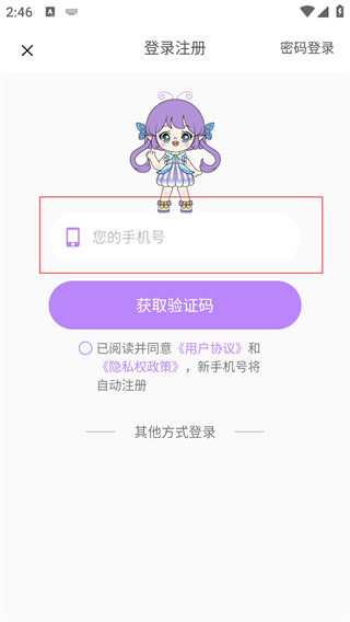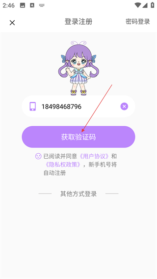 3、在登录注册界面,输入手机号码,勾选已阅读并同意协议后,可点击【获取验证码】进行登录注册操作。