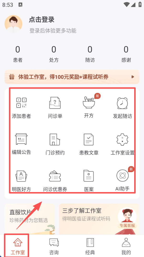1、进入软件后,先点击底部 “工作室” 板块,这里可操作添加患者、开具处方等多项工作相关功能。
