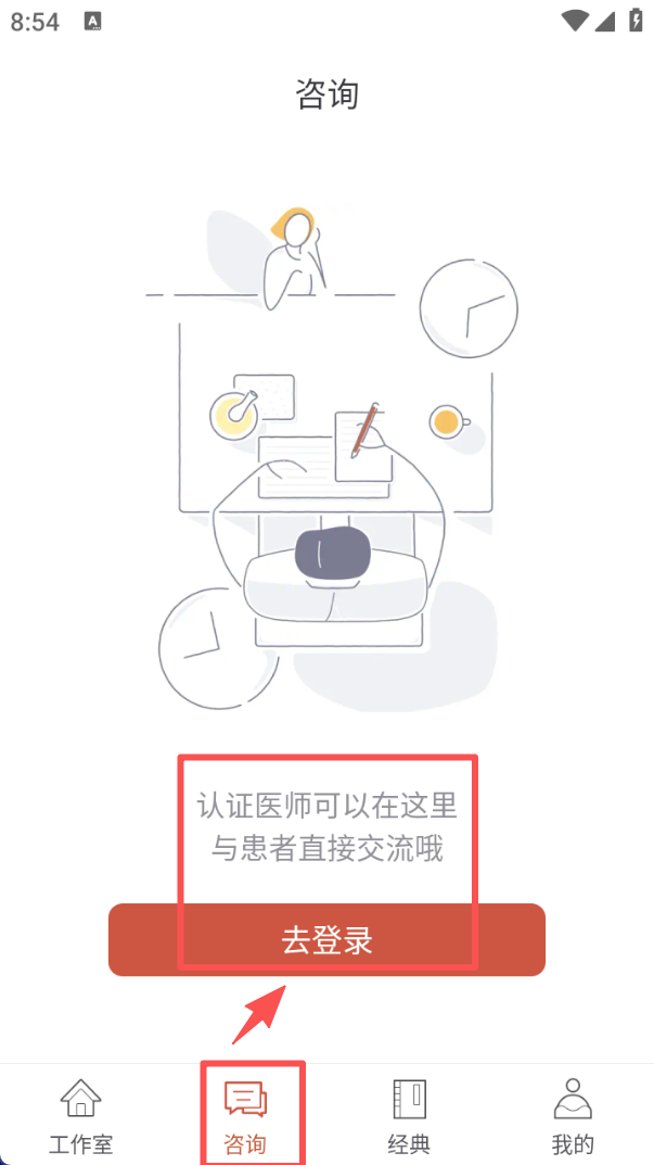 2、切换至 “咨询” 页面,完成登录后,认证医师就能在此板块与患者展开直接的沟通交流。