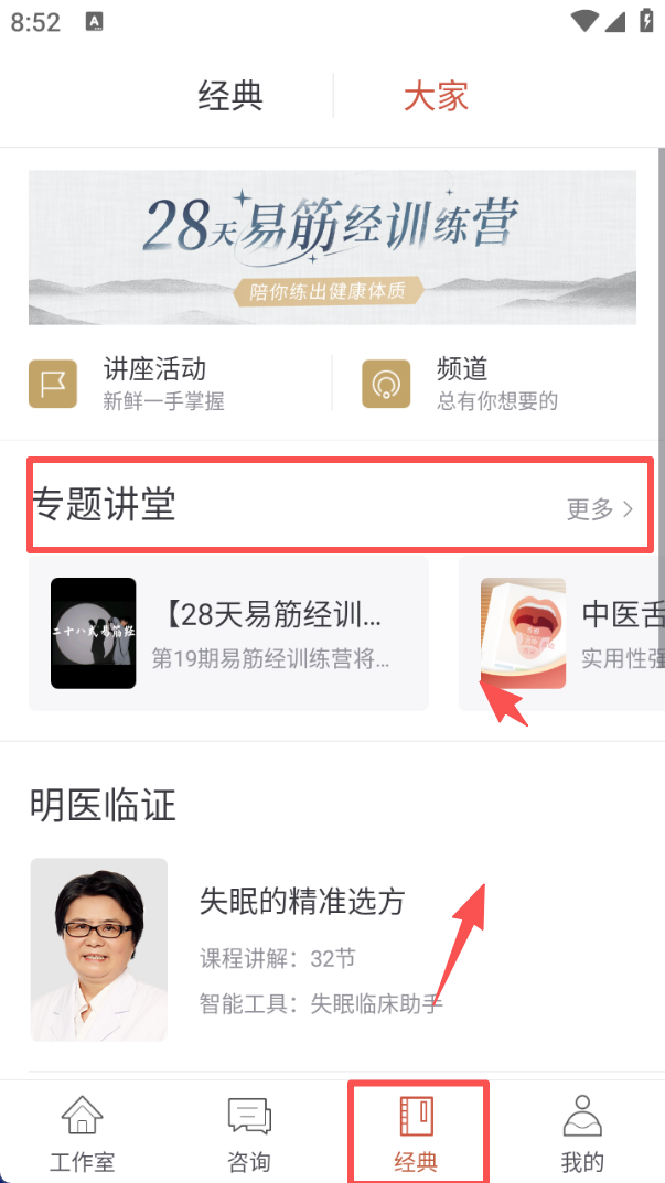 3、点击 “经典” 栏目,能查看专题讲堂、明医临证等内容,获取专业的健康与诊疗相关课程。