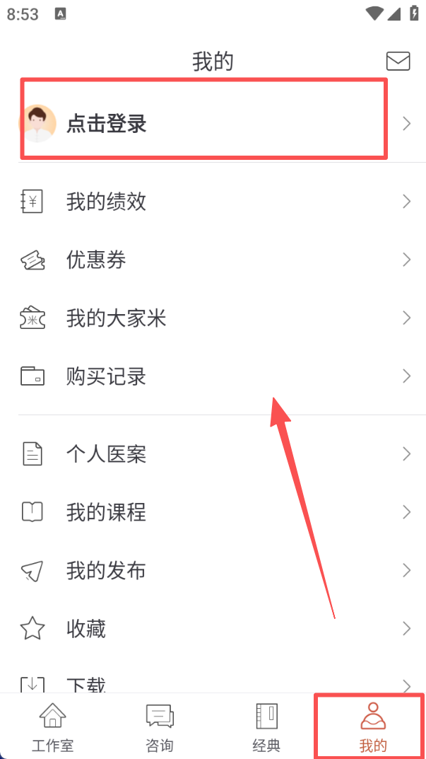 4、进入 “我的” 界面,可进行登录操作,同时能查看绩效、优惠券、个人医案等个人相关信息。