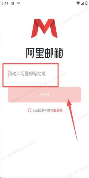 2、在地址栏输入完整阿里邮箱账号,确认已阅读政策后点击下一步继续。