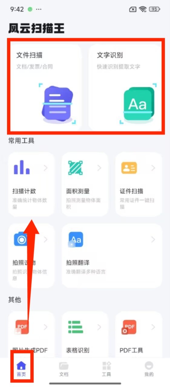 1、进入首页,能看到文件扫描、文字识别等核心功能入口,下方常用工具里还有扫描计数、证件扫描等实用选项可选用。