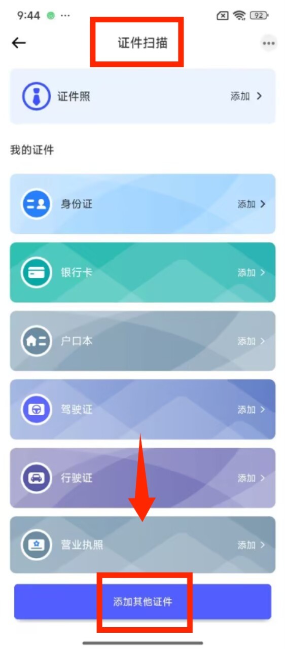 2、进入证件扫描页面,可选择身份证、银行卡等常见证件类型进行添加,也能点击 “添加其他证件” 拓展更多证件类型。