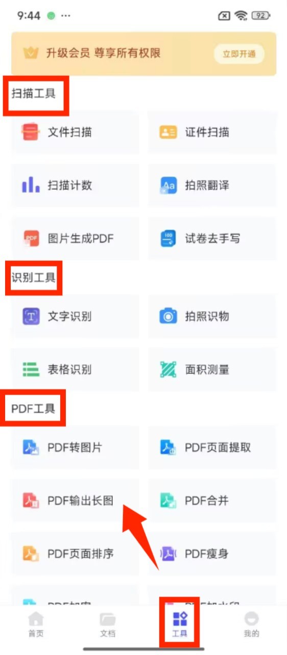 3、点击底部 “工具” 按钮,页面划分了扫描工具、识别工具、PDF 工具等板块,各类功能按分类清晰呈现便于查找。