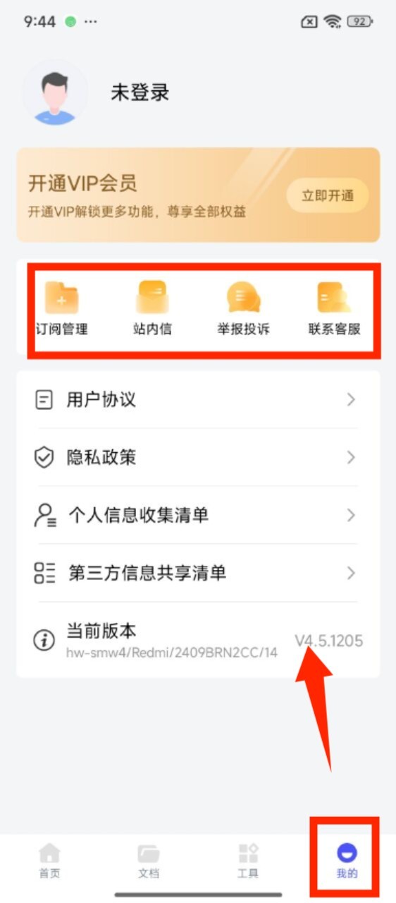 4、进入 “我的” 界面,能看到订阅管理、站内信等功能入口,同时可查看用户协议、隐私政策等平台相关说明内容。