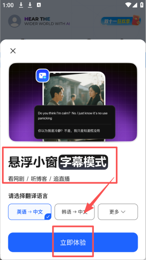 4、在字幕模式页面,选择翻译语言后,点击“立即体验”开始使用。