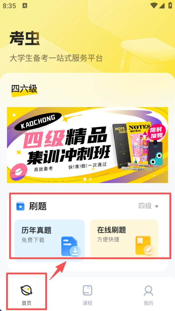 1、进入考虫首页,在四六级板块下找到刷题区域,可选择下载历年真题,或直接进入在线刷题板块开启练习。