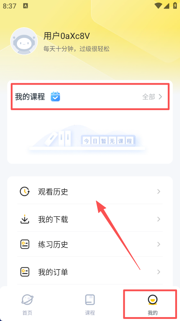 4、进入 “我的” 界面,在 “我的课程” 板块可查看已购课程安排,同时能管理观看历史、下载内容等学习相关记录。
