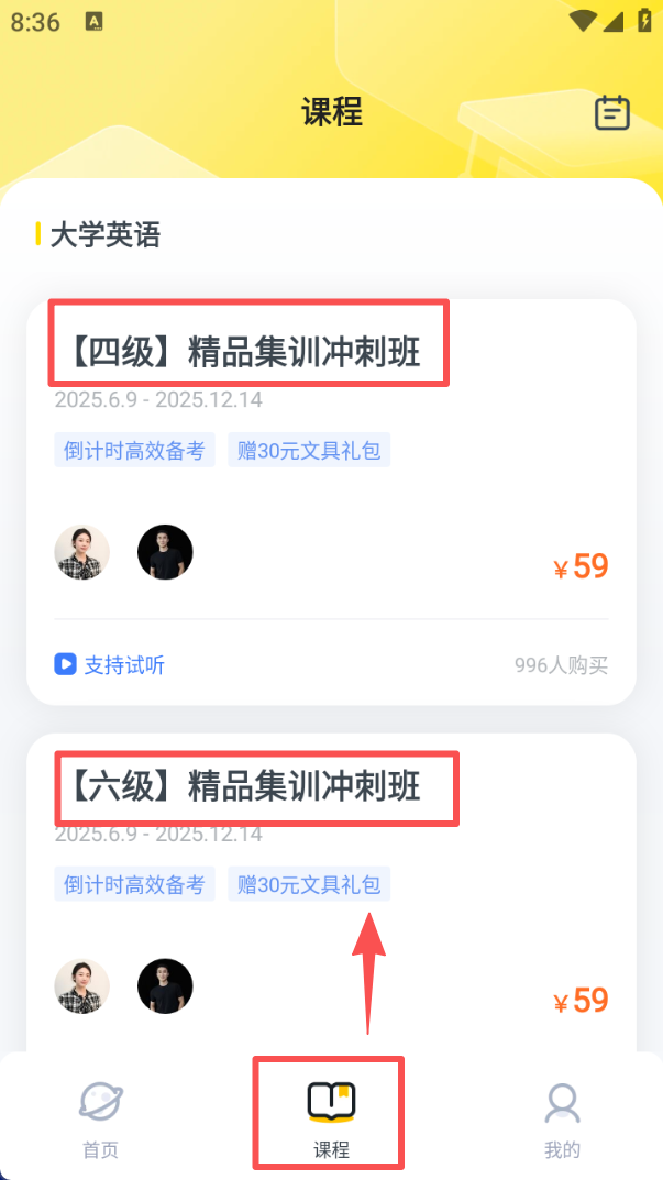 2、点击底部 “课程” 按钮,页面会展示大学英语类的四六级精品集训冲刺班,能查看课程时间、价格等信息。