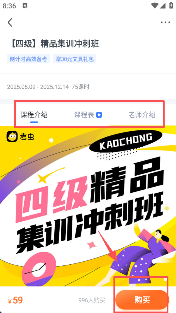 3、点击对应课程进入详情页,可查看课程介绍、课表及讲师信息,确认需求后点击页面底部的 “购买” 完成选课。