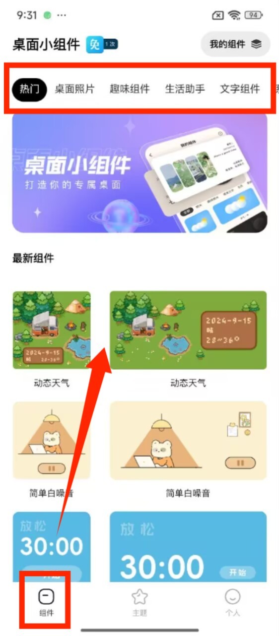 1、点击底部 “组件” 栏,页面上方会呈现热门、桌面照片等分类标签,下方 “最新组件” 板块可浏览各类小组件内容。