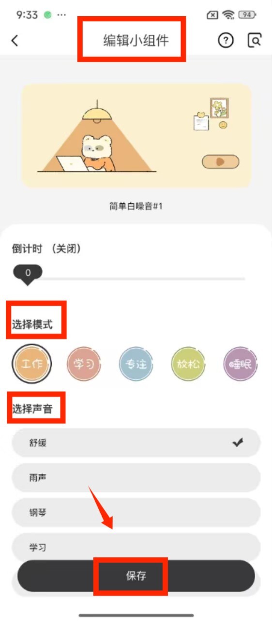 2、选中任意组件进入 “编辑小组件” 页面,可在 “选择模式” 里选定场景,“选择声音” 中挑选音效,完成后点击 “保存”。