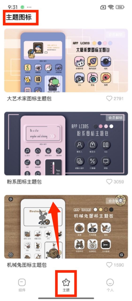 3、切换到 “主题” 栏,页面展示 “主题图标” 相关内容,能浏览大艺术家、粉系等不同风格的图标主题包。