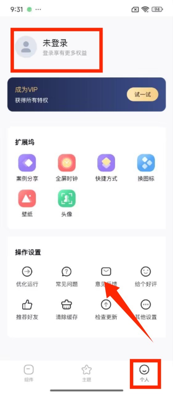 4、进入 “个人” 页面,顶部显示 “未登录” 状态提示,下方 “扩展坞”“操作设置” 板块可使用对应功能选项