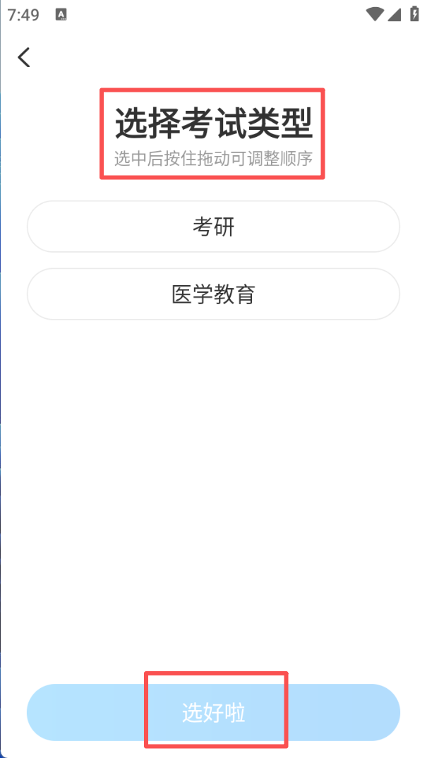 1、进入页面后,先在 “选择考试类型” 处选定对应类别,按住选项拖动能调整排序,选好后点击底部 “选好啦” 进入下一步。