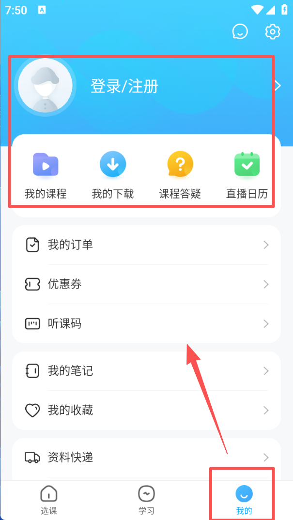 3、点击底部 “我的”,能看到登录 / 注册入口,还有我的课程、我的下载等功能选项,可管理个人学习相关事项。