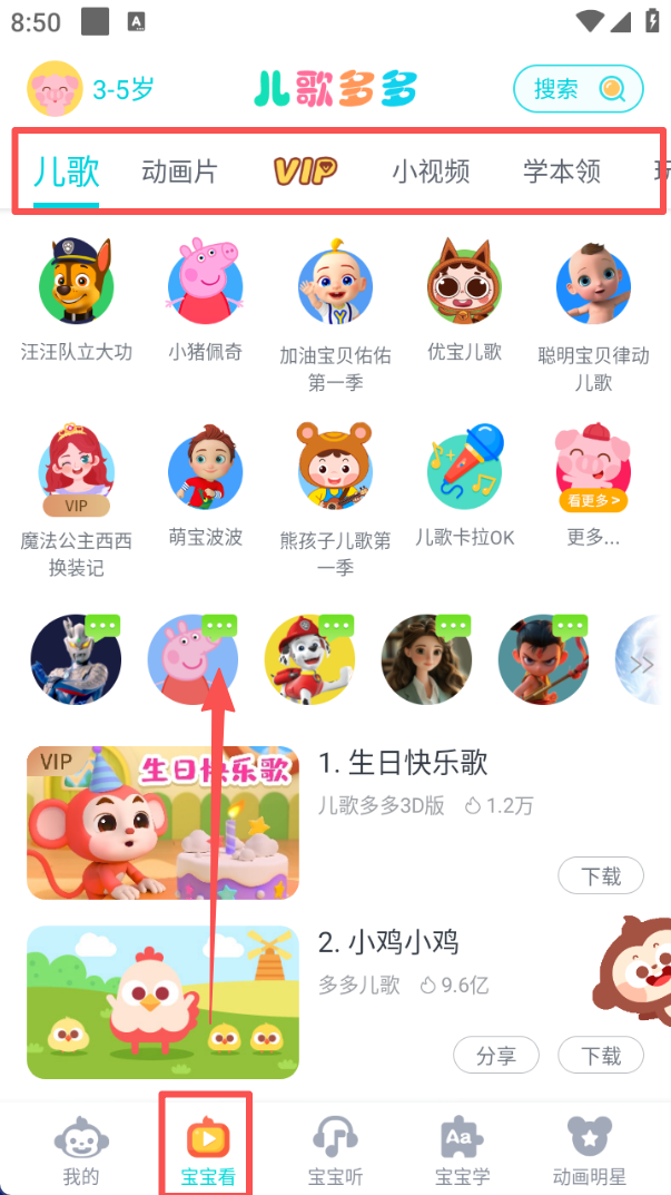 1、点击底部 “宝宝看”,页面会呈现儿歌、动画片等分类栏,还能看到汪汪队、小猪佩奇等 IP 内容,可直接选择播放。