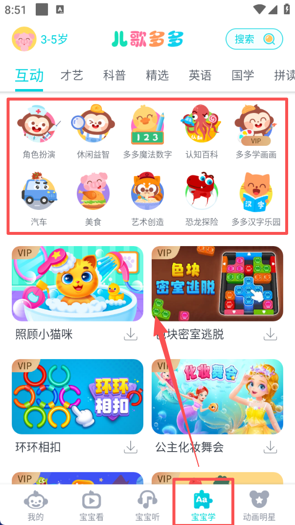 3、点击底部 “宝宝学”,进入后可看到互动、才艺等分类,包含角色扮演、休闲益智等趣味学习类功能入口。