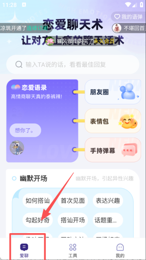 1、进入恋爱聊天术的爱聊板块,可在幽默开场等分类里选择搭讪相关内容。