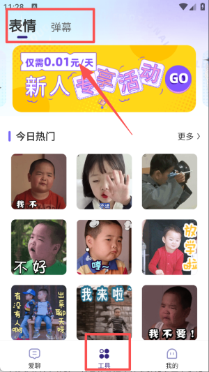 3、点击工具板块,可在表情、弹幕分类中挑选合适的素材辅助聊天。