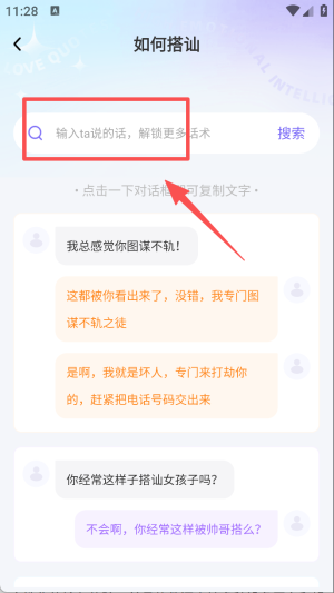 2、在如何搭讪页面的搜索栏,输入对方说的话,能解锁更多聊天话术。