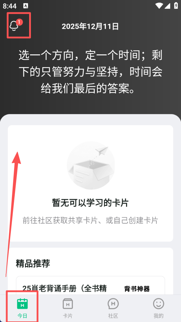 1、进入 “今日” 页面,顶部会显示日期与励志语句,当前若无学习卡片,可前往社区获取共享内容或自主创建。