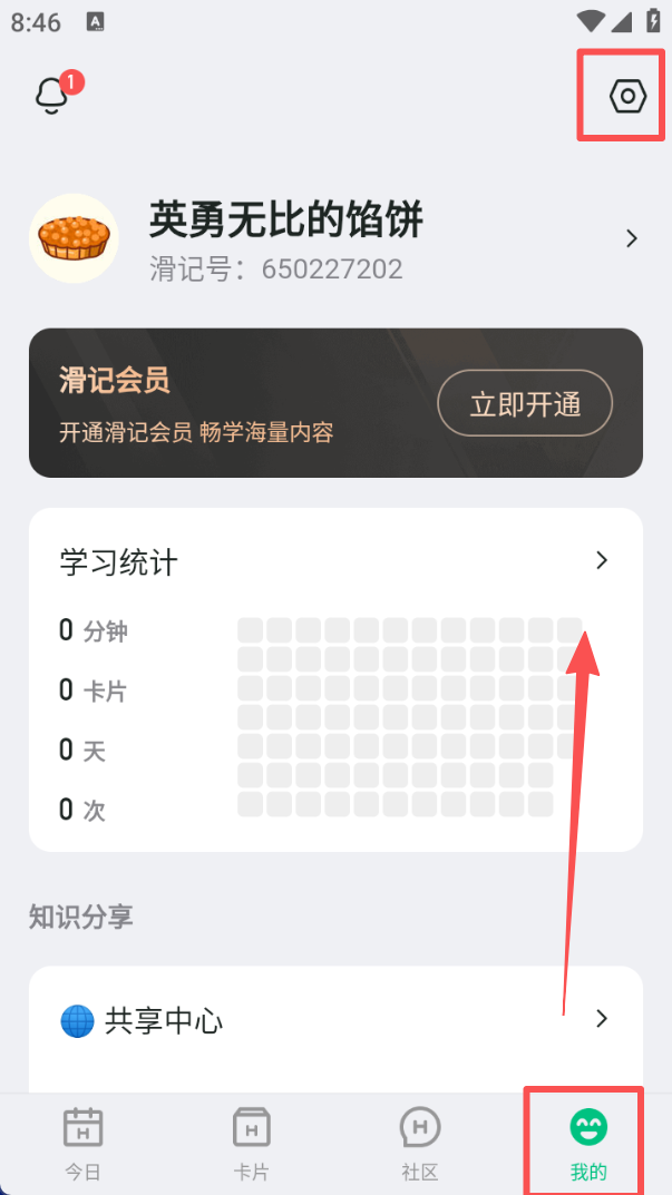 4、进入 “我的” 界面,可查看个人学习统计数据,同时能找到滑记会员开通入口,还可通过设置按钮调整相关功能。