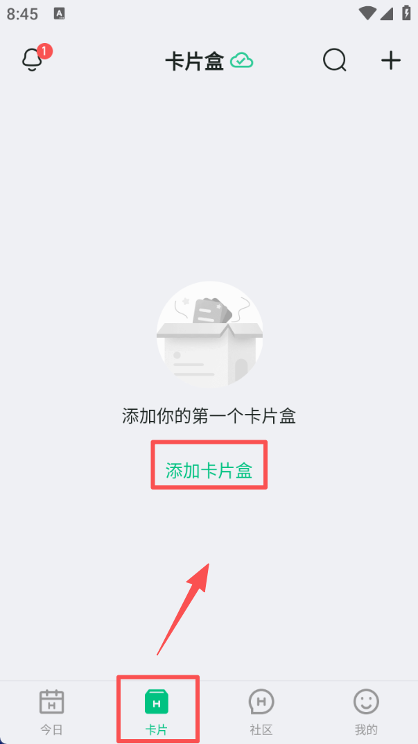 2、点击底部 “卡片” 按钮,进入卡片盒页面,若暂无内容,可点击 “添加卡片盒” 按钮,创建专属的学习卡片分类。