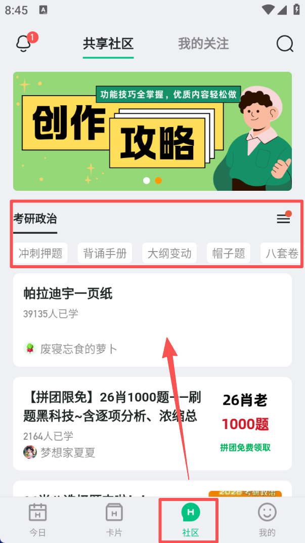 3、切换到 “社区” 页面,在共享社区板块下,能看到考研政治等分类,还有冲刺押题、背诵手册等学习资源可选用。