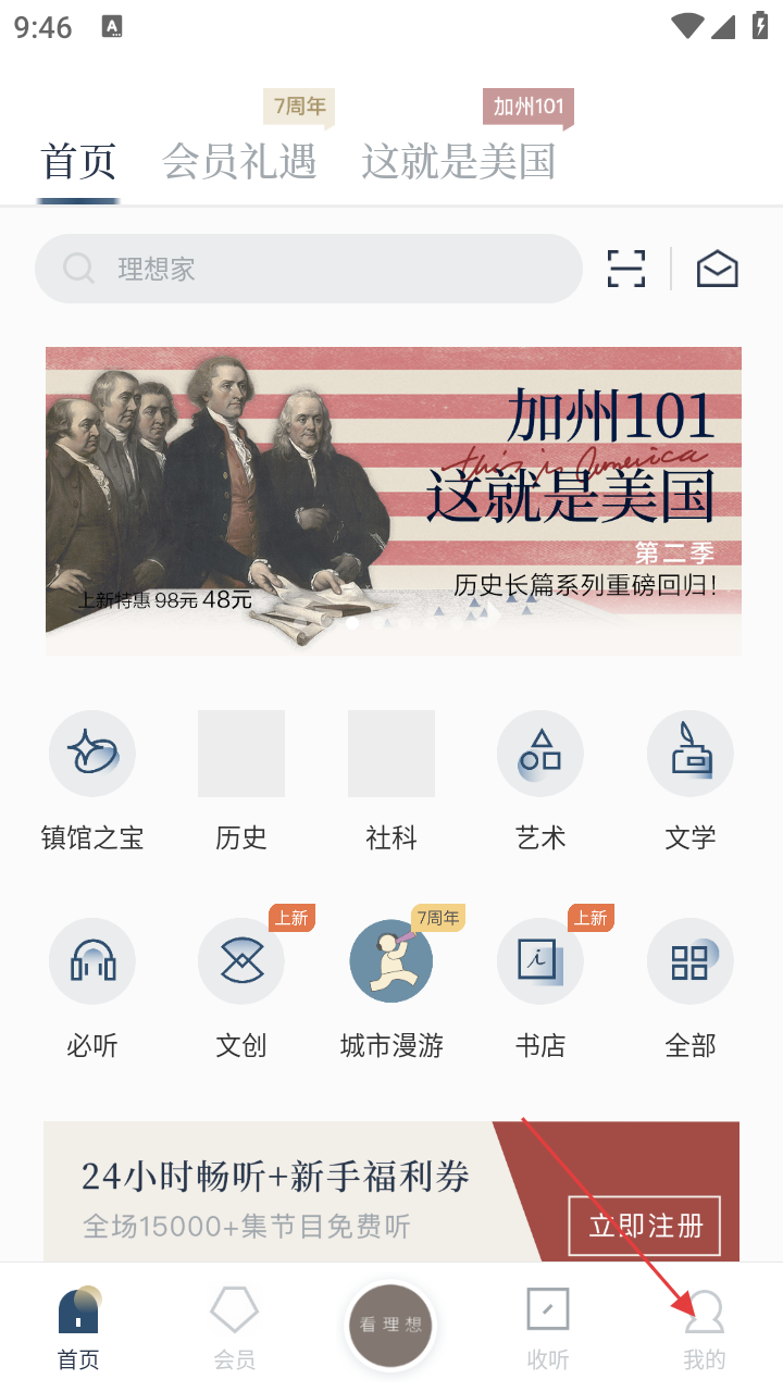 1、在看理想APP首页,可浏览镇馆之宝、历史、社科等板块内容,点击【我的】进入个人页面。